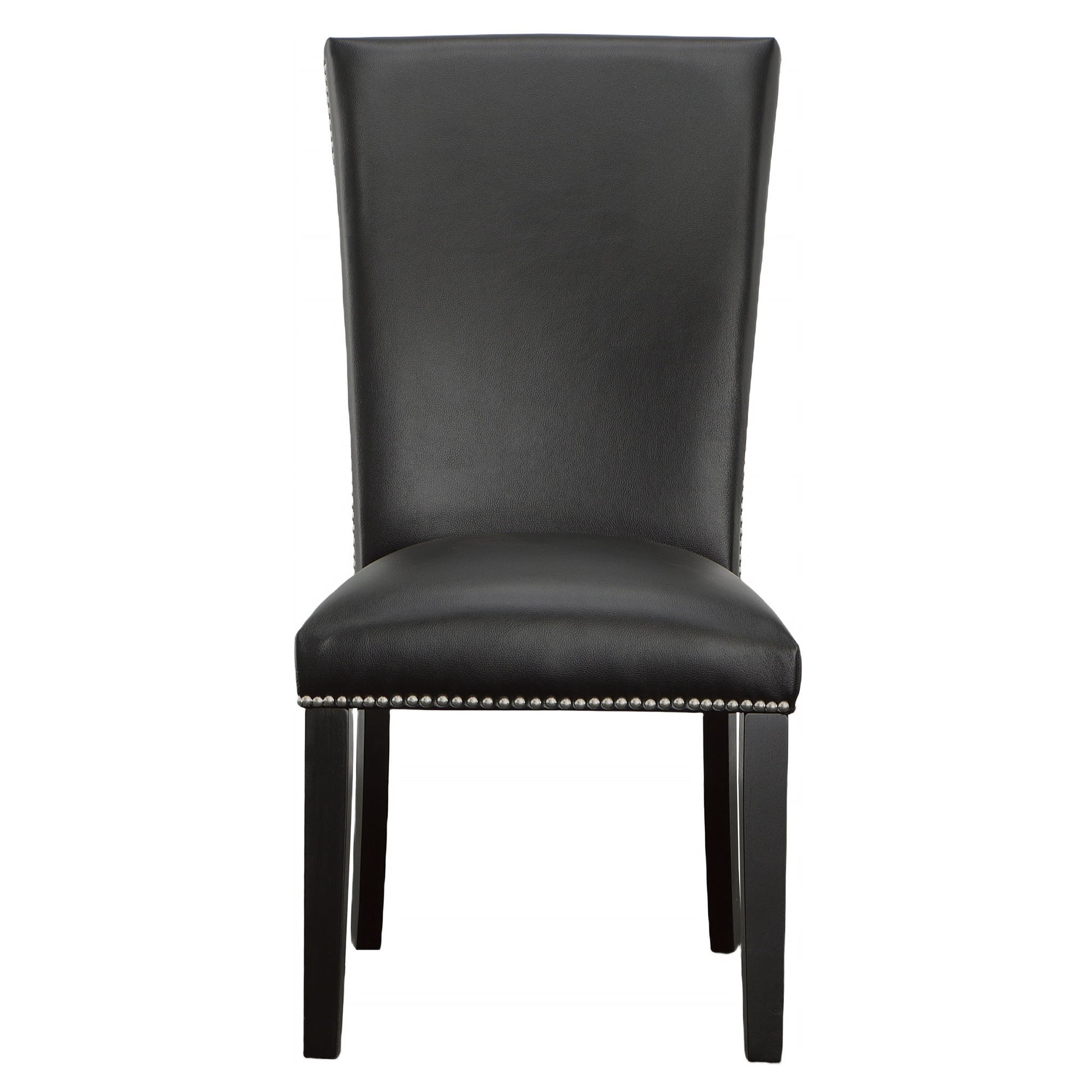 Elegant dining with a modern twist, the Camila dining chairs are available in black or silver faux leather or an upscale blue velvet material. The chairs feature sturdy, solid wood construction and are accented by stylish silver nail head trim and feature a curved back for comfort and support.