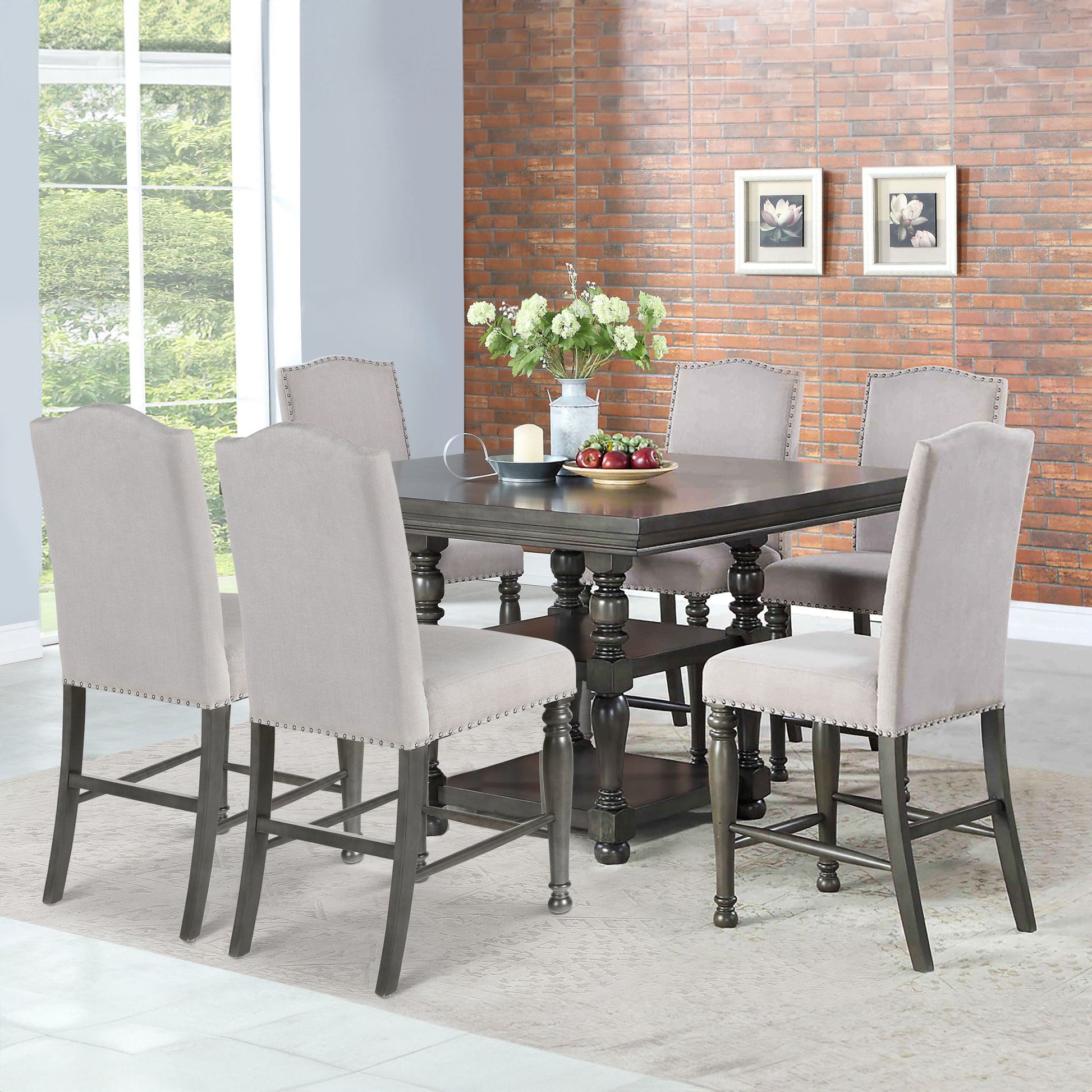 Transitionally styled, the Caswell Counter Height Dining Set offers elements of traditional and contemporary design to fit with virtually any decor. Turned legs on the table's pedestal blend beautifully with the fashion-forward harbor grey finish with light distressing. Two convenient shelves in the pedestal are perfect for storage or display. Matching counter chairs feature beautifully turned front legs and a shield back with nickel nail head trim accents. Four-sided stretchers add stability and a comfortable foot rest.