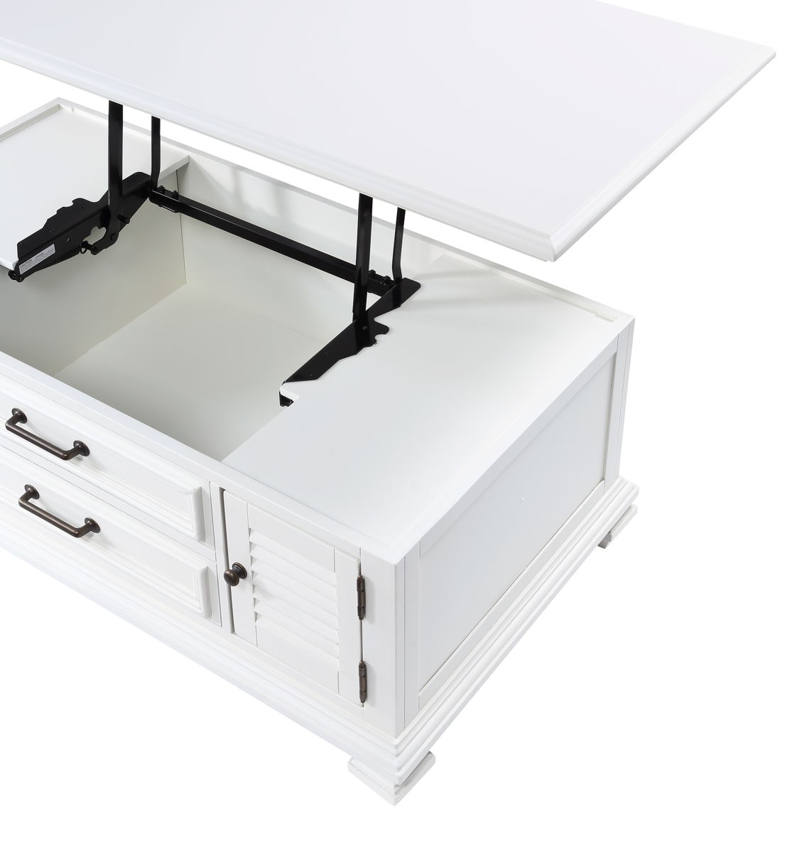Modern farmhouse design in a compact design that fits comfortably in any room, the Charlestown Lift-Top set offers looks and multiple function to spruce up any room. The Lift-Top Cocktail Table anchors this collection with dual door storage and the "eat from the couch" convenience offered from the lift-top. The Storage End Table offers USB recharging convenience and hidden storage while the End Table offers a more architectural look that complements the cottage elements in the collection beautifully. Mix and match the styles of the collection in a crisp, clean finish that will brighten any room.