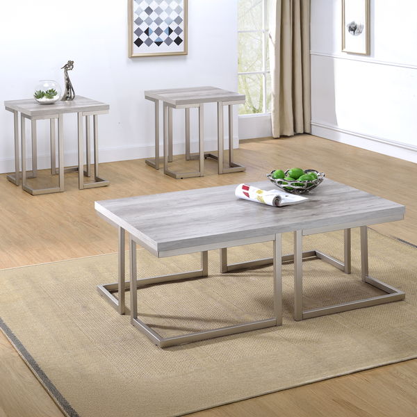 Refined rustic style comes to your living room with David occasional tables from Steve SIlver Company. The contemporary styled matte pewter colored base features an interesting geometric shaped base that combines with the Silvershield® driftwood colored top to create a table collection comfortable in today's neutral environments. Choose from cocktail or end table.