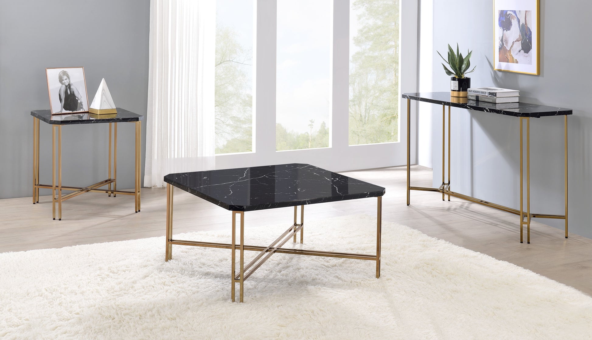 - Styling details include faux black marble top, clipped corners, and delicate twin-post legs