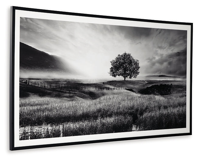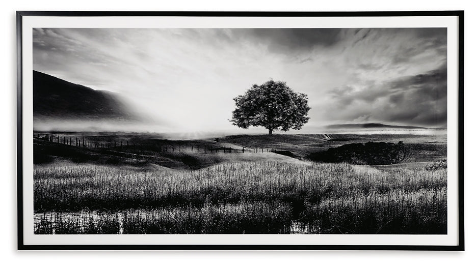 Filled with calming natural elements, this wall art has a refined look with a restful feel. It captures a landscape with rolling hills, drawing your eye to the tree standing tall in the center of the creation. Lighter tones in the clouds bring brightness to the black and white design, making for a striking addition to your modern decor.