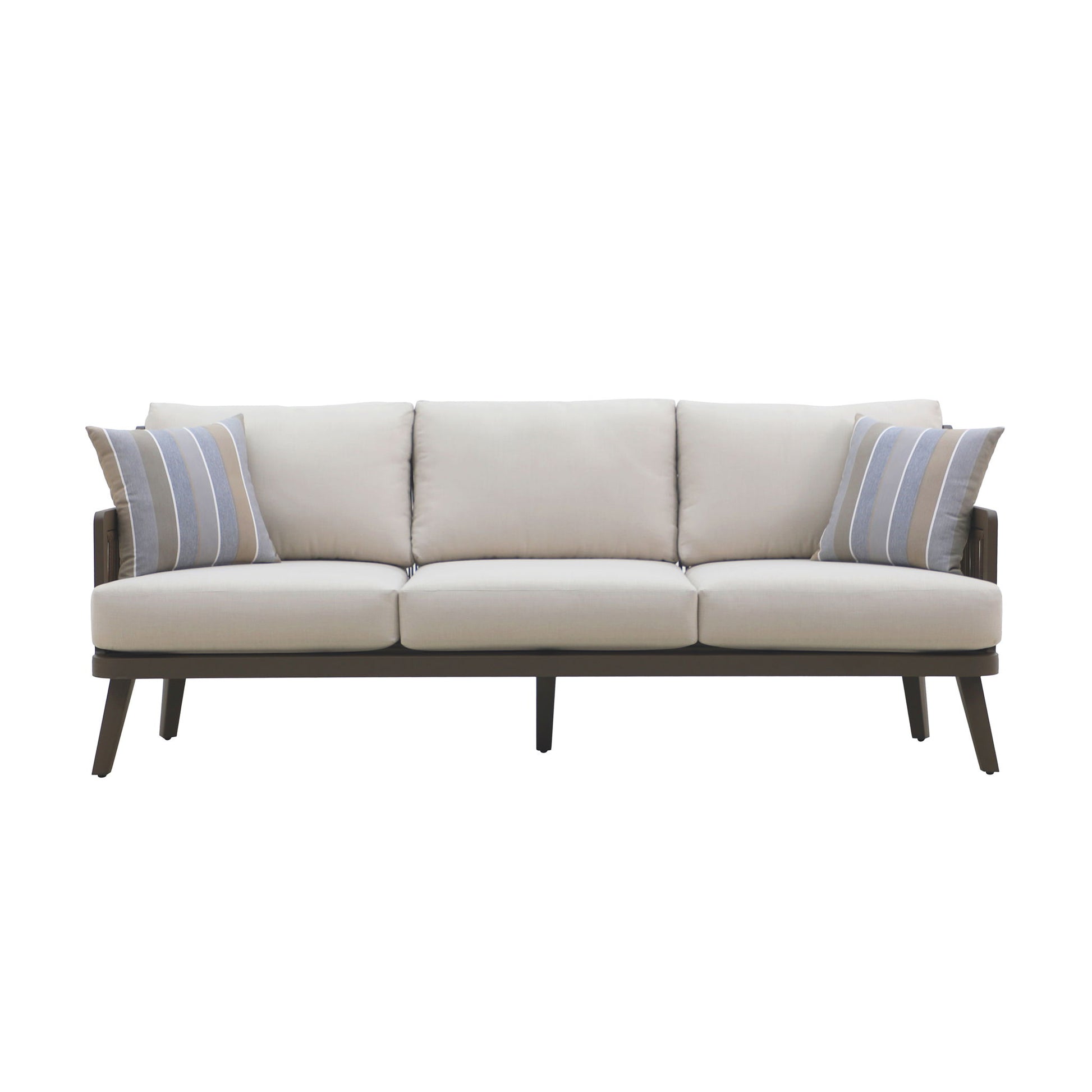 The Genova Patio Set, featuring a spacious patio sofa and a stylish coffee table, effortlessly combines durability, comfort, and modern sophistication for any outdoor space. Built with durable aluminum frames and a baked-on powder coat finish, this set offers superior scratch resistance and long-lasting performance. Designed for all-weather durability, the furniture is wrapped in high-density PE wicker, an eco-friendly synthetic resin that provides the classic look of wicker with the added benefits of being low-maintenance, colorfast, and resistant to water, mildew, and fading. The sofa features plush 6 ½" high-density foam seat and back cushions upholstered in premium light gray Sundura™ fabric—a solution-dyed 100% polyester that resists fading, mildew, and moisture, ensuring vibrant color and lasting protection season after season. The coffee table’s slatted top adds a classic touch while promoting water drainage for added practicality. Designed with clean lines, neutral tones, and a woven rope seat back, this set delivers an open, airy feel with solid structural support. The minimalist design is enhanced by evenly spaced vertical strands, bringing a refined texture and contemporary elegance to any outdoor setting.