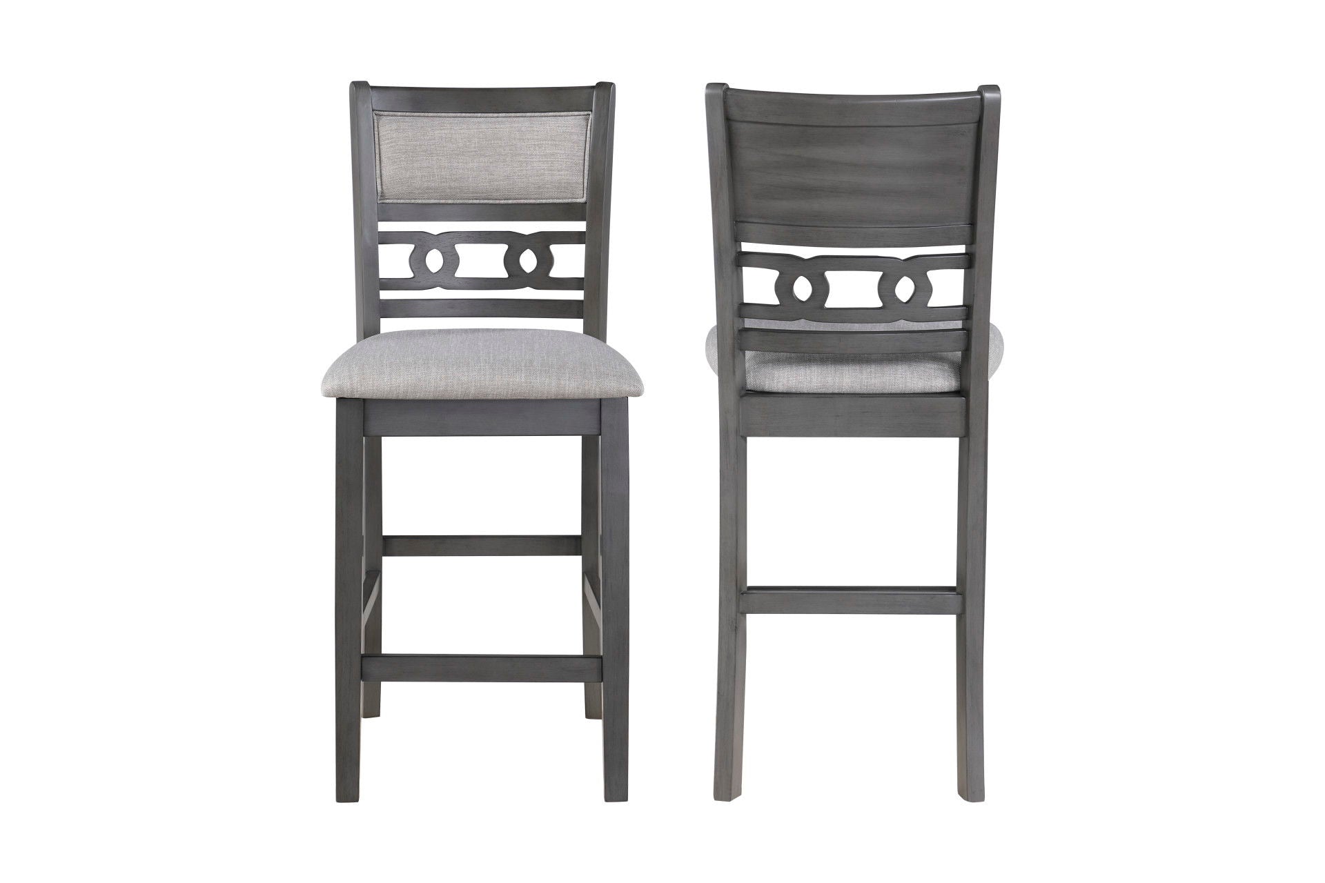Enhance your dining room with this set of 2 New Classic Gia Counter Chairs in a warm finish. Crafted from solid Rubberwood and Mindi veneers, these chairs combine durability with timeless beauty. The versatile finish accentuates the natural wood grain. Designed for comfort and longevity, the chairs feature black PU upholstered cushions and backs. Solid wood legs, reinforced with four base stretchers doubling as footrests, ensure stability. The distinctive transitional style, highlighted by interlocking chain chair back detail, tapered legs, and clean lines, seamlessly integrates into any setting. Assembly is hassle-free with all necessary hardware and clear instructions included. Backed by a one-year warranty, these Gia Counter Chairs offer a practical and stylish seating solution for your space. Invest in quality and design with this contemporary dining chair set.