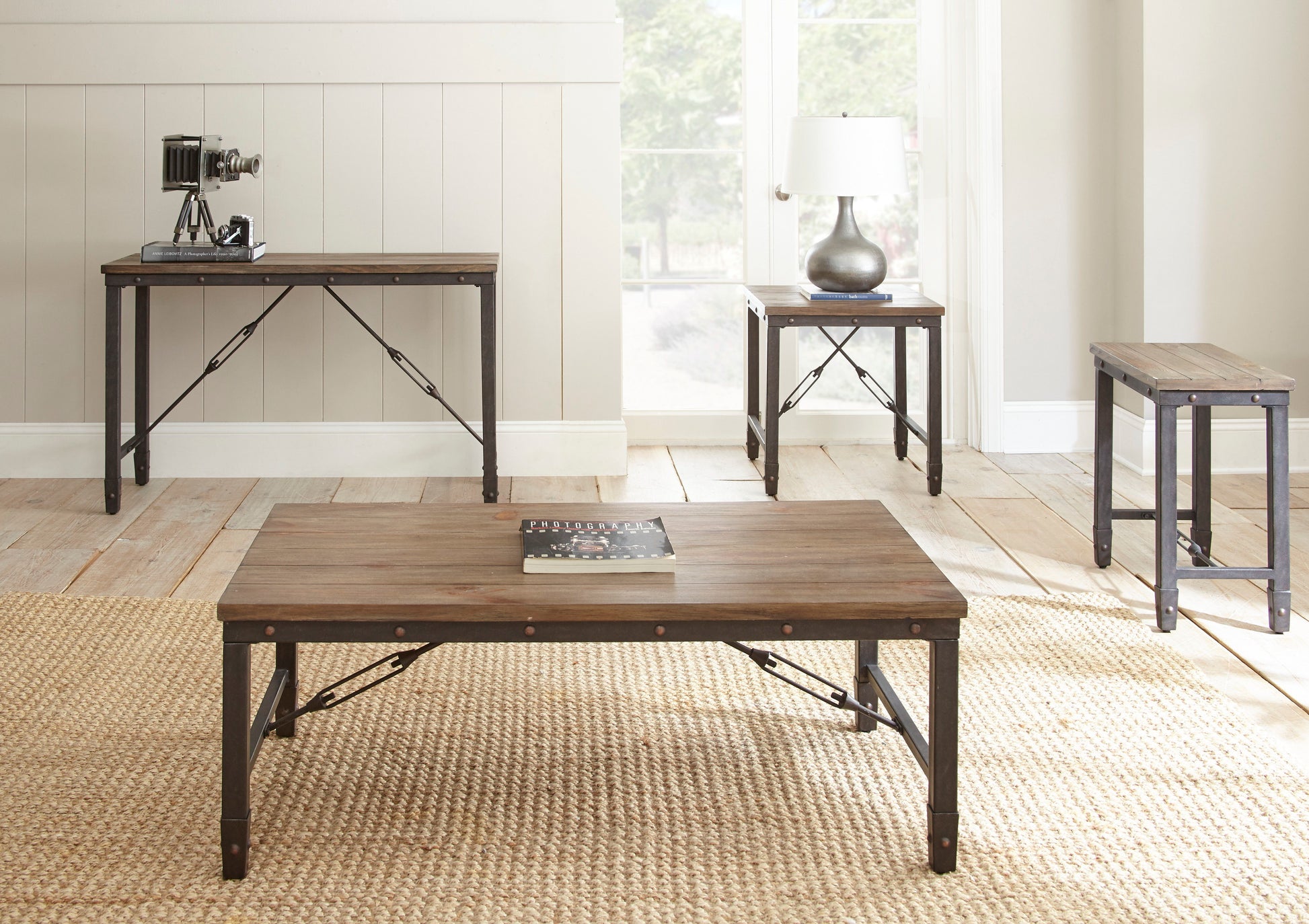 Make it industrial with the rustic Jersey Occasional Collection from Steve Silver Company. Table tops feature a vintage plank-effect finished in a a warm antiqued tobacco stain that blands effortlessly with the iron metal base. The metal top rail features a rivet look that works beautifully with the under-top stretchers. Choose from Cocktail or End Table or get both!