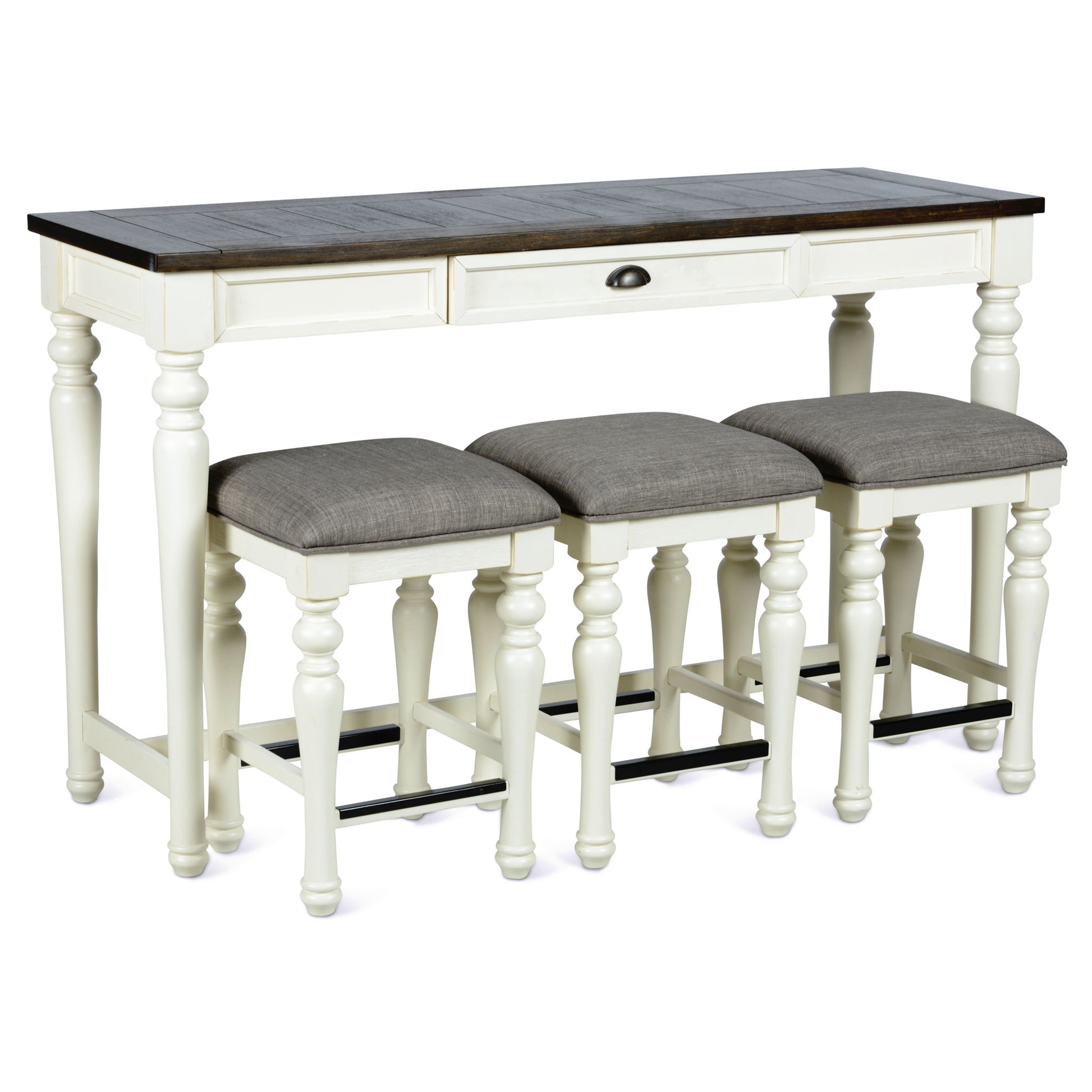 Add instant stadium seating to your living room with the 4-piece Joanna Sofa Bar Set. This set includes Sofa table and three stools that can be placed behind a Sofa, in a hall or in a compact dining area to give instant extra seating to family and guests. The Sofa Bar works great as an accessory piece in an open floor plan or as an extra desk. The two-tone ivory and mocha finish and farmhouse design work well with many of today's casual styles and the piece can be used alone or paired with the many pieces in the burgeoning Joanna occasional and dining collection.
