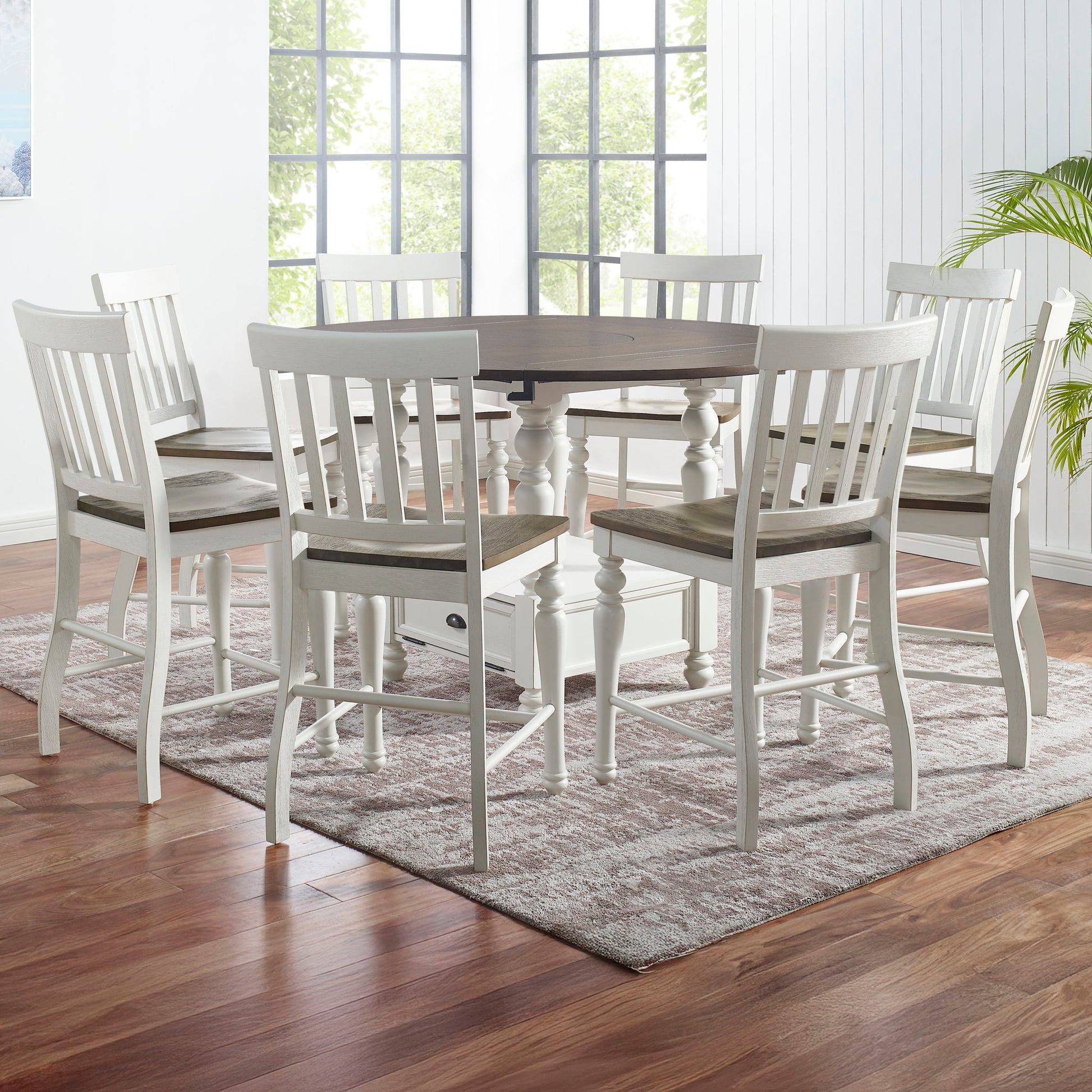 Classic farmhouse styling is updated for today's dining with the Joanna Two-Tone Round Counter Height Dining Set. Sturdily constructed from hardwood solids and acacia veneers with a two tone finish. This 59 inch round table is packed with features the entire family will love starting with a double-drop leaf top that expands to seat up to eight. At the heart of the table-top is a lazy susan that makes serving dinner much easier! The turned leg counter base features a drop-down storage compartment for easy storage. Counter height chairs feature turned front legs, stretchers for stability, footrail with metal kick plate and a slat back. Your purchase includes one counter height dining table and 6 counter height chairs.