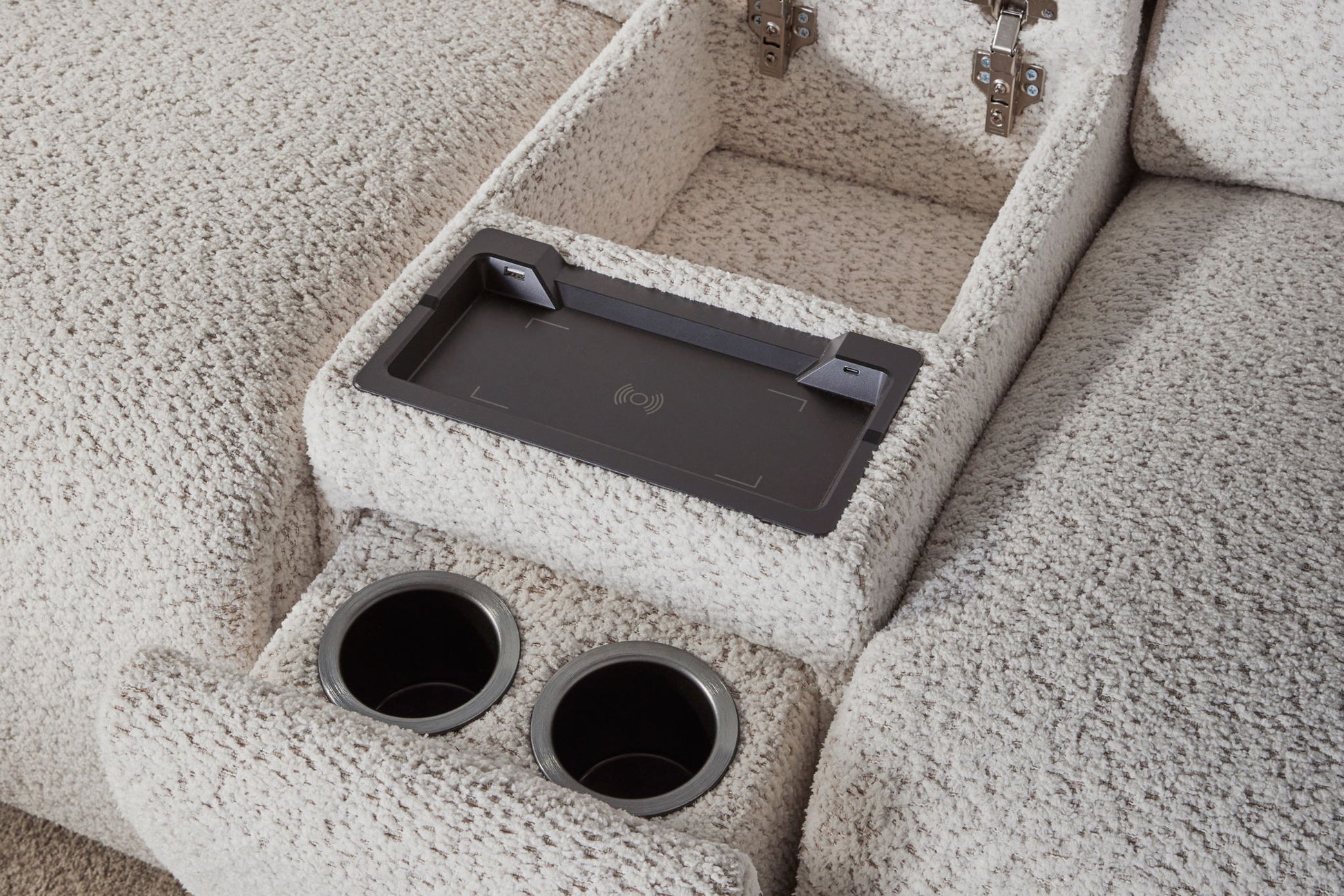 Lancaster features a zero-gravity power recline, adjustable power headrest, stylish track arms, and deep seats offering plush support. Its built-in USB and USB-C chargers make it easy to charge devices. The tilting console includes hidden cupholders, a wireless charging tray, and lift-top storage. Made with FSC-certified wood from a solar-powered facility, the Lancaster is eco-friendly and compatible with any FreeMotion® bracket.