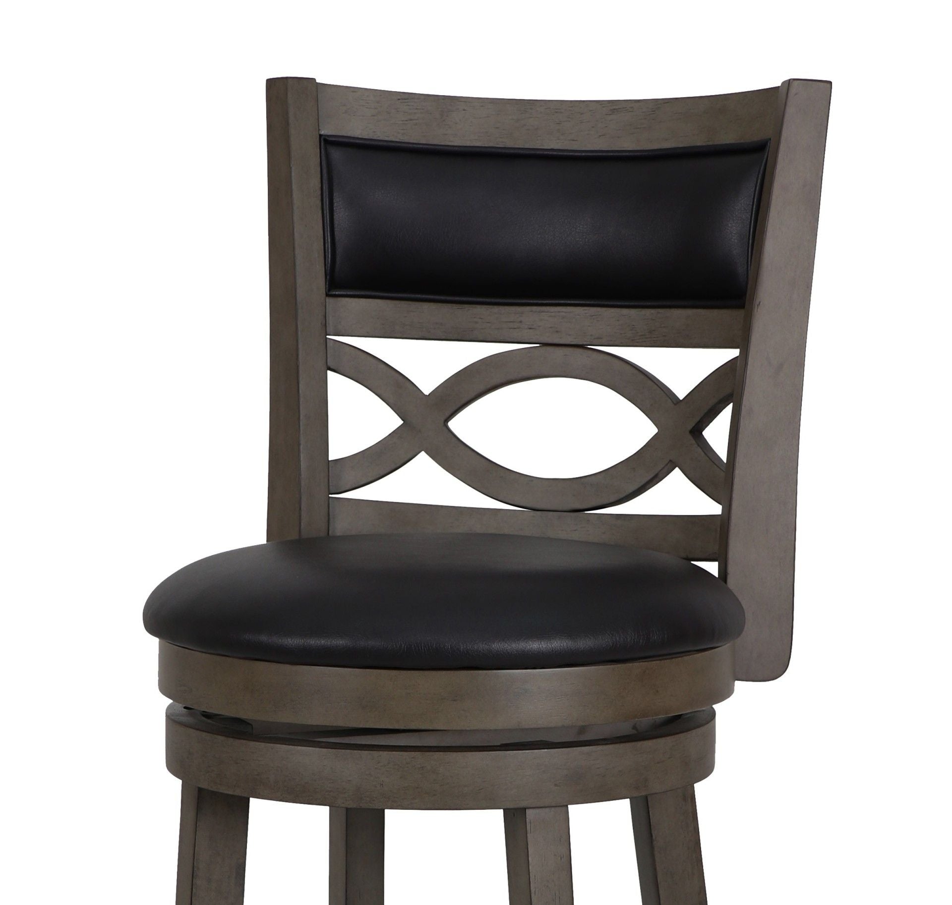 The New Classic Furniture Manchester Pub Height Swivel Bar Stool is a functional and durable seating solution designed for comfort and style. Crafted from quality Rubberwood solids and manufactured wood, ensuring long-lasting strength. Featuring a seat height of 29”, the stool's legs are reinforced by a circular footrest, providing added stability and functionality. With a 360-degree swivel, this barstool effortlessly rotates for convenient use at kitchen islands or bars. The full foam seat cushions and backrests, upholstered in easy-care light gray 100% polyester fabric, offer a plush and cozy seating experience. The distinctive interlocking wave wood back and thickly welted upholstery add a touch of sophistication to the overall design. Easy assembly is a snap with the included instructions. Elevate your bar, counter, or kitchen island with the Manchester Bar Stool, where durability meets distinctive style.