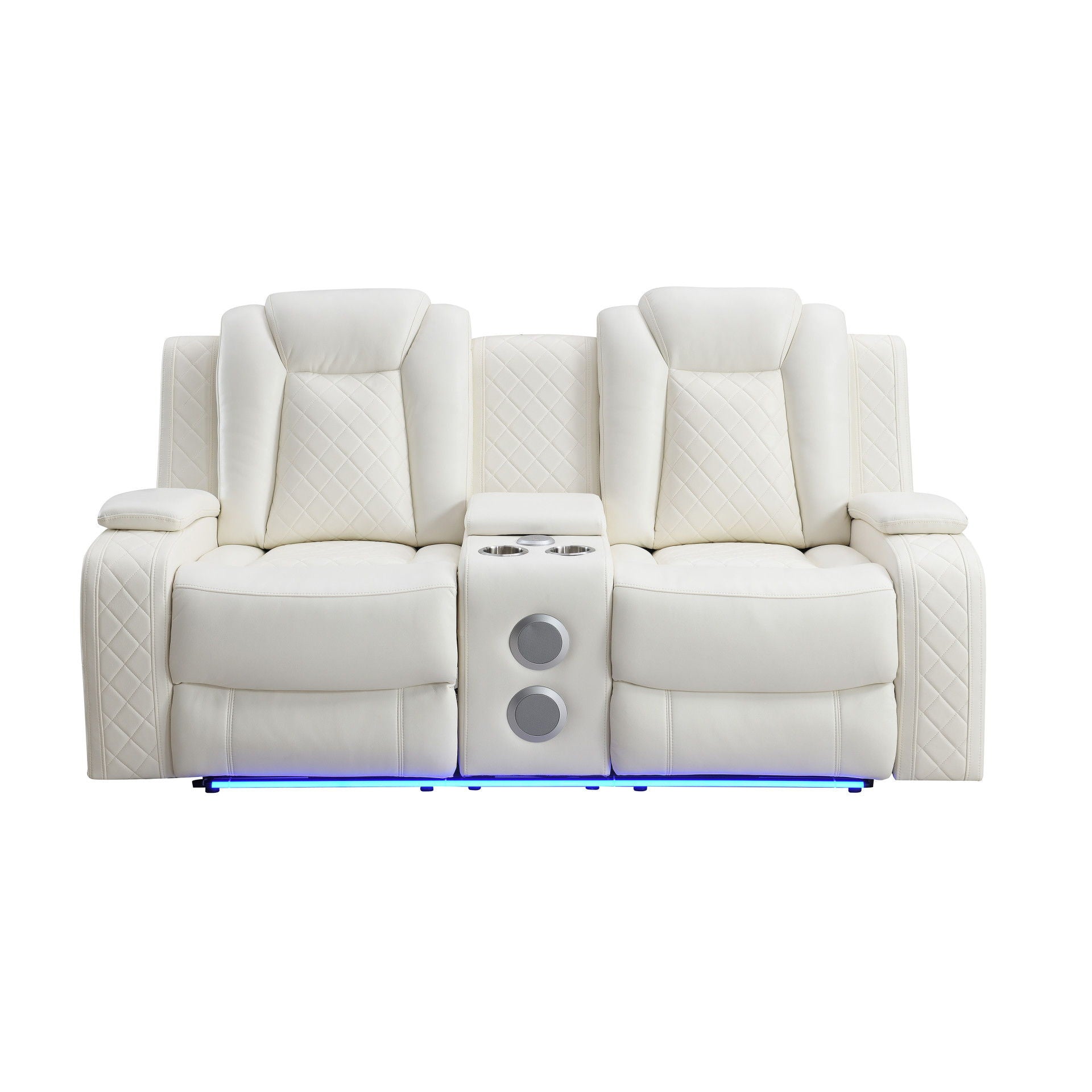Meet the Orion Console Loveseat, a marvel of durability and comfort designed to elevate your relaxation experience. Crafted with a blend of hardwoods and manufactured wood, its sturdy construction ensures long-lasting strength. Sink into the soft, breathable upholstery, a luxurious blend of polyester and PU, for a supple feel and cozy seating. Experience smooth reclining action thanks to top-quality mechanisms, while high-density foam and pocket coil cushions wrapped in Dacron offer unparalleled support. Expert tailoring, including white contrast stitching and a distinctive diamond pattern, adds a touch of sophistication to its sleek design. Lift up the pillowed arms to reveal convenient storage compartments and silver drink holders. Complete with theater lighting, Bluetooth speakers, wireless charging pad, and USB ports, this loveseat brings the movie theater experience to your living room. Upgrade your comfort with the Orion Console Loveseat today.