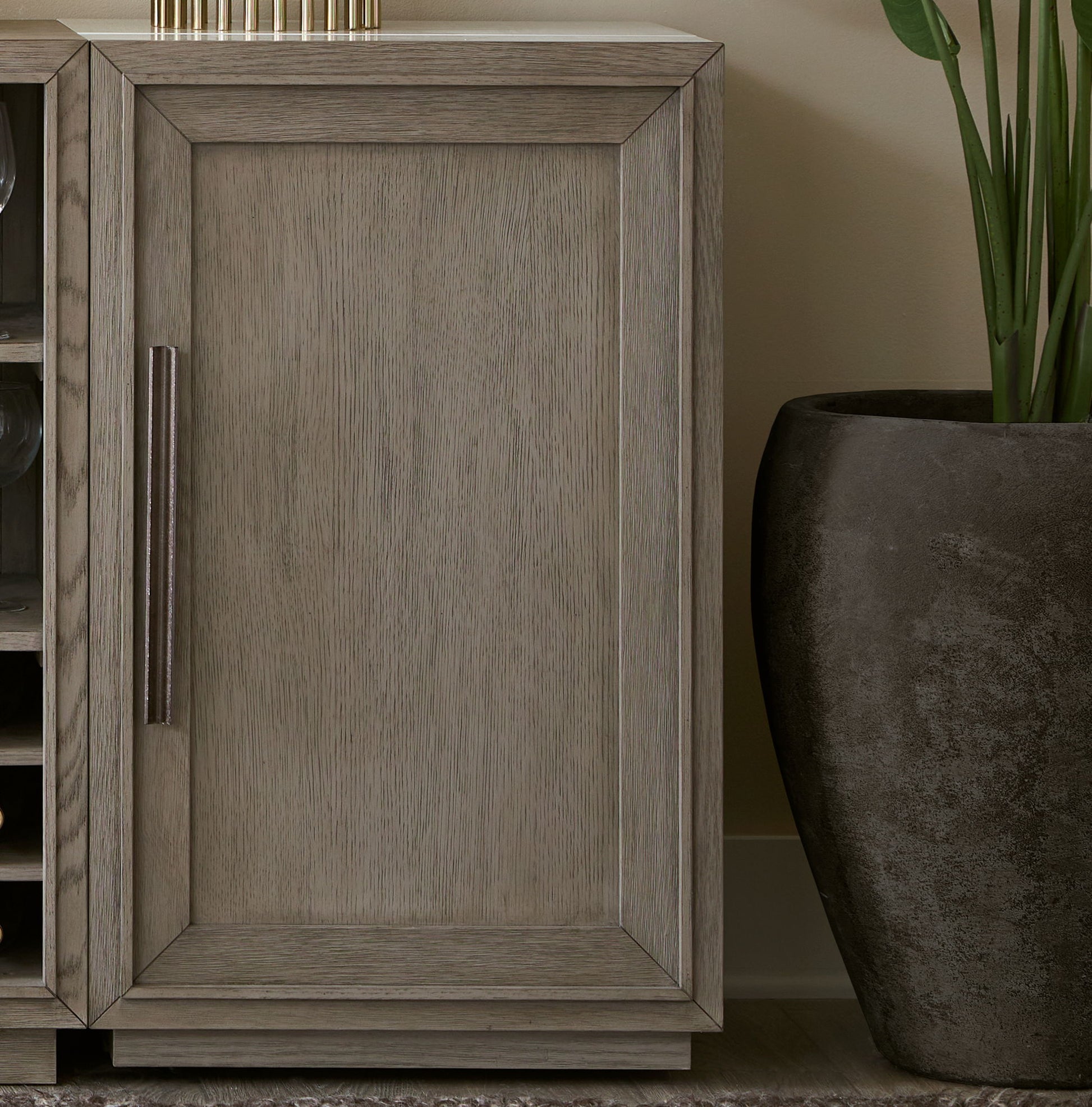 Introducing the Freestanding Bar Cabinet, the perfect addition to any home entertaining space. This stunning bar cabinet is designed to make your life easier, whether you're hosting a dinner party, entertaining guests, or just relaxing with a drink after a long day. With its fashionable quartz top, this bar cabinet is ideal for food and beverage preparation, and its recessed panel door pulls open to reveal a spacious interior, fully equipped with shelving sized to accommodate popular sizes of bottles, mixers, beverages, and accessories. The top drawer is perfect for keeping your bartending tools close at hand, so you can always be ready to mix up your favorite drinks. The Freestanding Bar Cabinet is crafted from beautiful oak and ash solids and straight-grain oak veneers, accentuated by a cool taupe Moonstone finish. Custom burnished nickel hardware adds sophistication, making this bar cabinet a stylish and functional piece of furniture that will look great in any home.
