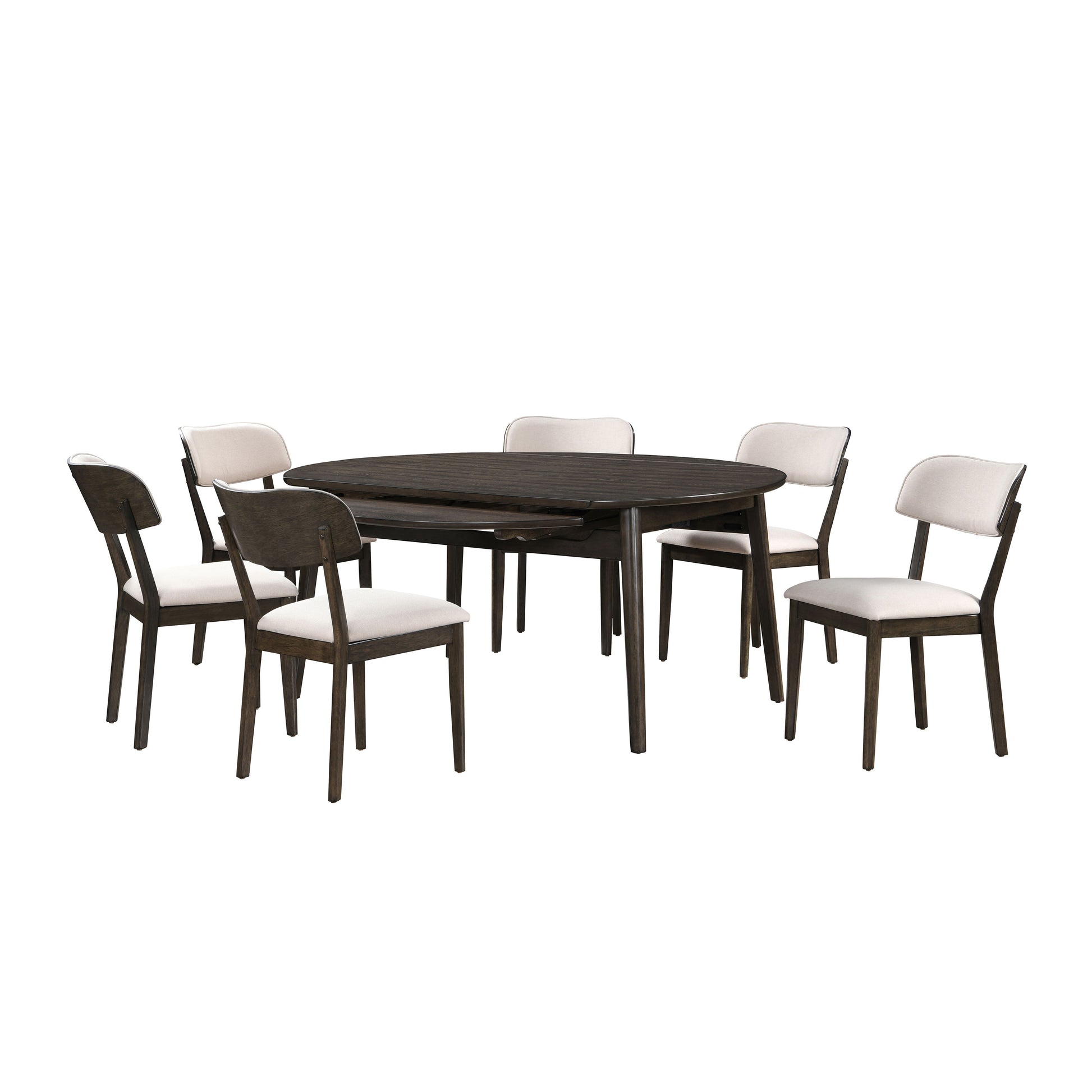 The Rex Mid-Century Modern Wood Dining Set offers a stylish and functional solution for your dining area. This set includes a 65" round dining table with self-storing leaves and chairs. Crafted from solid rubberwood, manufactured woods, and oak veneers, it ensures exceptional stability and longevity. The classic mid-century modern design features a minimalist aesthetic with clean lines, rounded edges, and angled, tapered legs, capturing the timeless elegance of the era. The multi-step finish, hand-rubbed with a clear topcoat, enhances the natural beauty of the wood grain. The chairs provide comfortable seating with softly rounded backrests and resilient foam seat cushions wrapped in 100% easy-care polyester fabric. The innovative round dining table extends with self-storing leaves to provide seating for six, making it perfect for both everyday meals and special occasions. This dining set combines quality construction, classic design, and practical functionality, making it a great addition to any home.