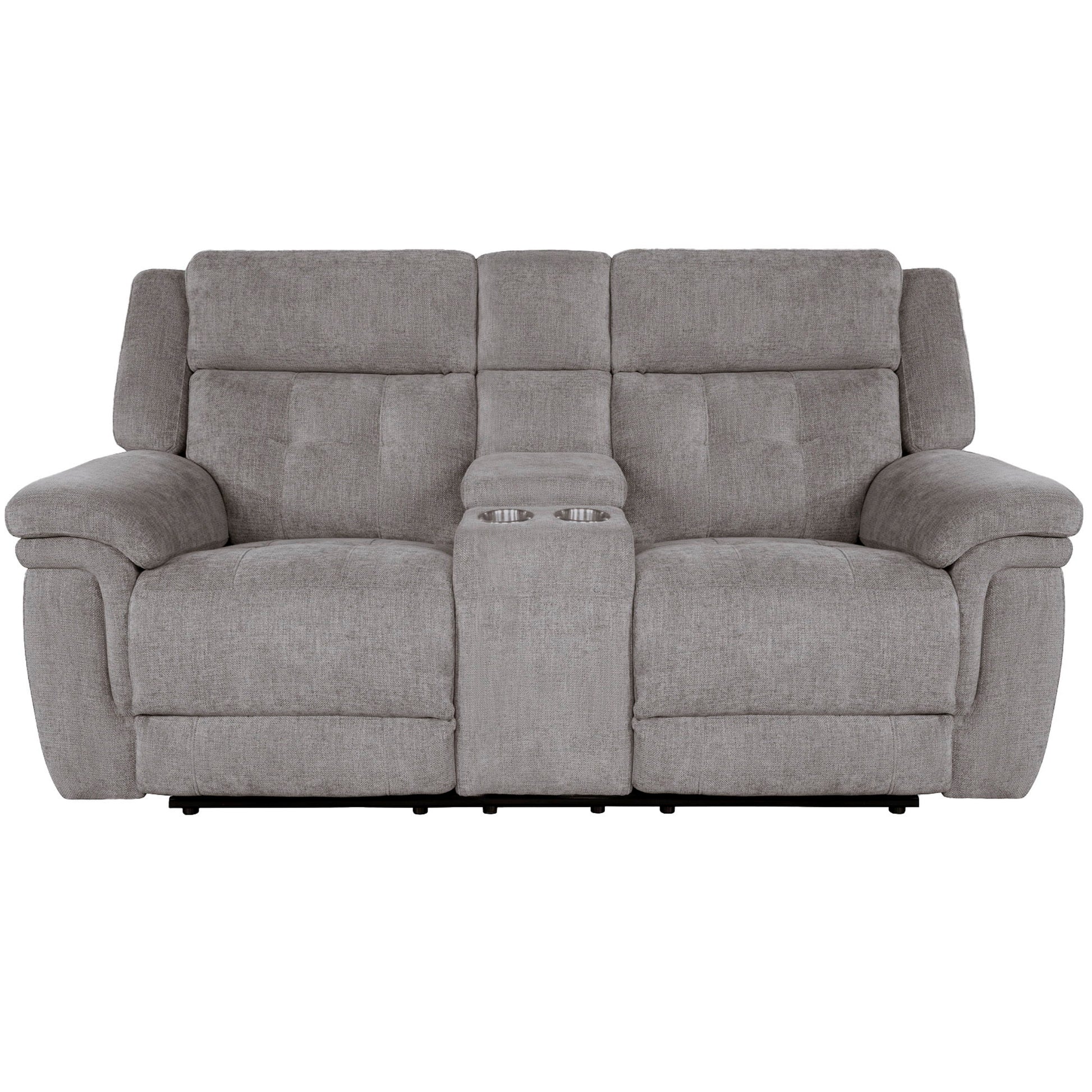 With its clean lines and transitional styling, the Richland Power Console Loveseat delivers a chic look and unbeatable functionality. The Richland Loveseat features a roomy storage console, two silver cup holders, USB/USB-C power outlets for easy charging, and beautiful quilted tufting across the body of the seat.