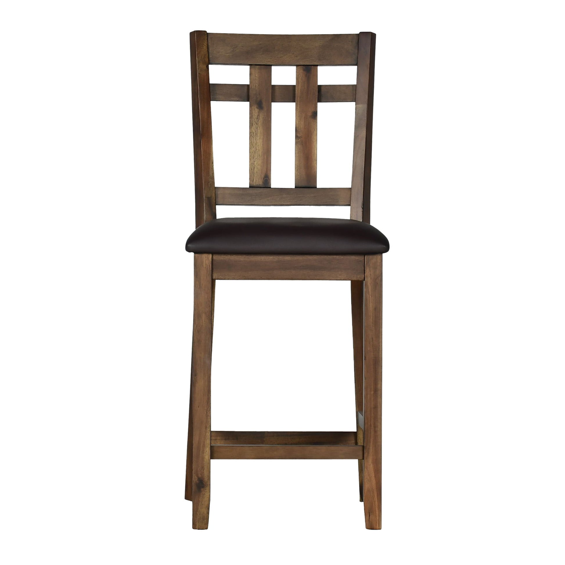 These Saranac Counter Chairs are great to use with the Saranac 5-Pack Dining Set or to use on their own at a counter or bar. Rustic styling in a mocha-finish, these Counter Height chairs look beautiful with the solid wood table Saranac table that features plank construction and a timber-beam platform base. The primitive, heirloom feel of the group works even better when you add these additional chairs. the Arts and craft influenced design pairs with easy-care polyurethane upholstered seats for a great care-free look.