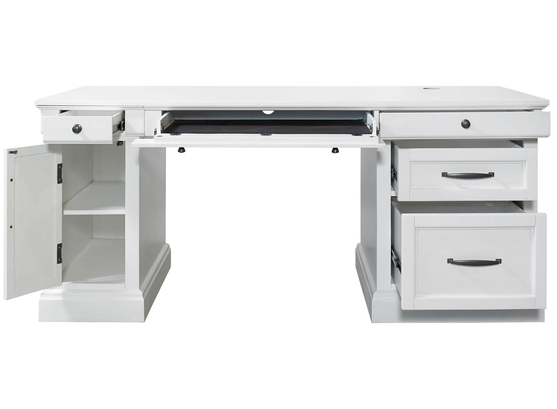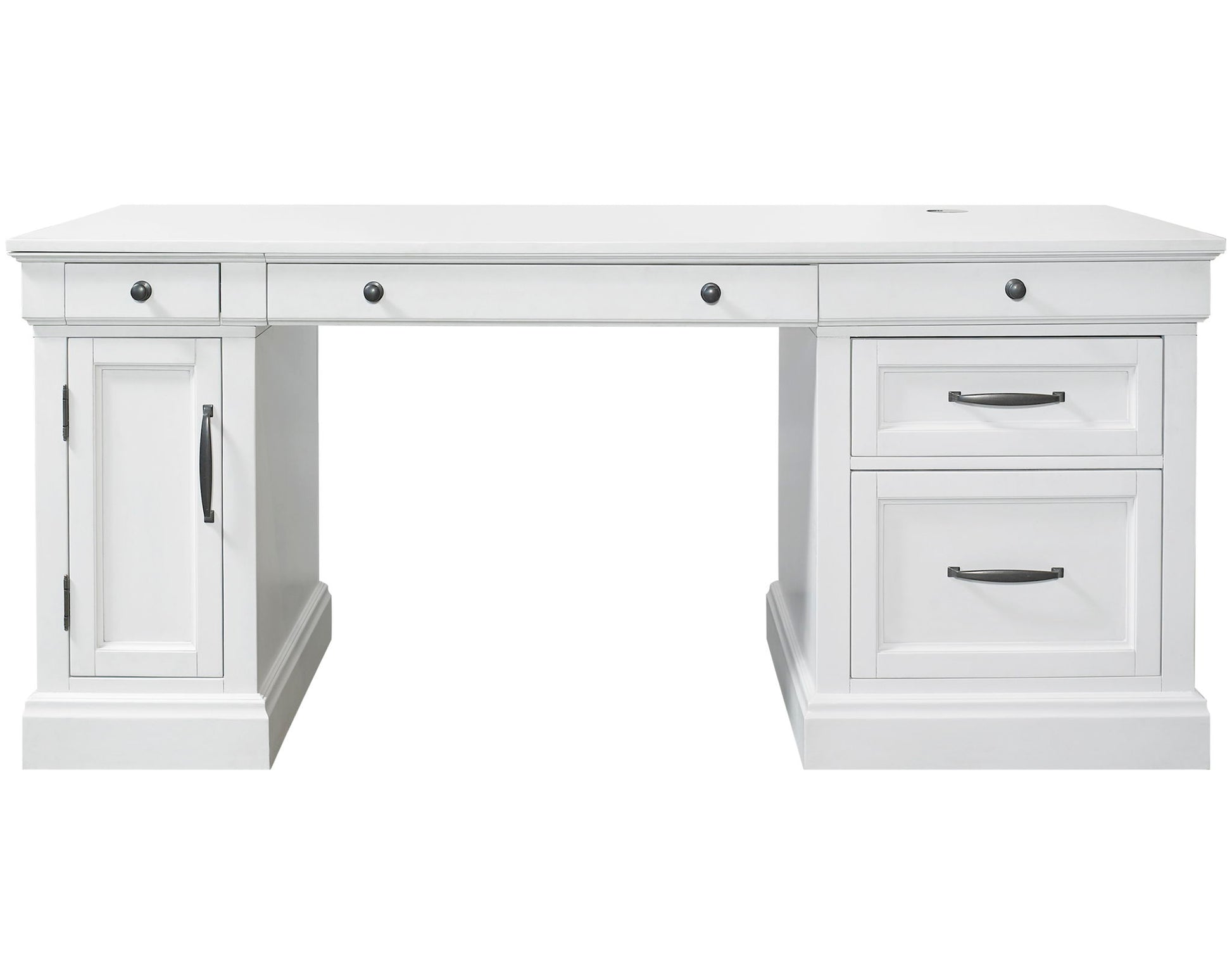 This classically refreshed pedestal desk is the perfect blend of timeless elegance and modern functionality. This stunning desk has been updated with traditional styling that complements today's homes, making it a perfect fit for any decor. This desk is simply stunning. The attention to detail is apparent in the custom-designed metal hardware in a timeless finish, which adds an extra touch of sophistication. This desk isn't just about looks. It's also designed to help you stay organized and productive. The drop-front keyboard drawer makes typing a breeze, while the integrated, dual USB/AC power center ensures that your devices are always charged and ready to go. With adjustable and removable shelves, you can customize your storage space to meet your needs. And the English dovetail drawer construction ensures durability, so you can enjoy your desk for years to come.