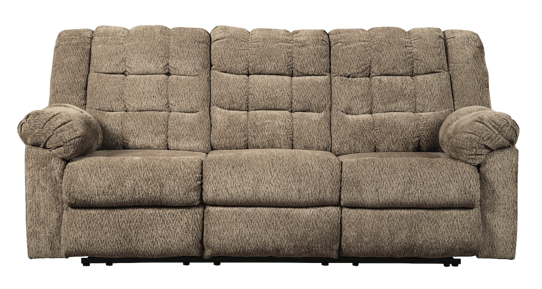 Saddle up for affordably priced luxury with the Workhorse reclining sofa. Stylish elements of this contemporary reclining sofa include biscuit back cushioning and incredibly thick and sumptuous pillow top armrests. Ultra neutral and wonderfully plush, the warm taupe upholstery is sure to complement an endless array of color schemes. Discreetly placed (inside arm) reclining tab maintains streamlined style.